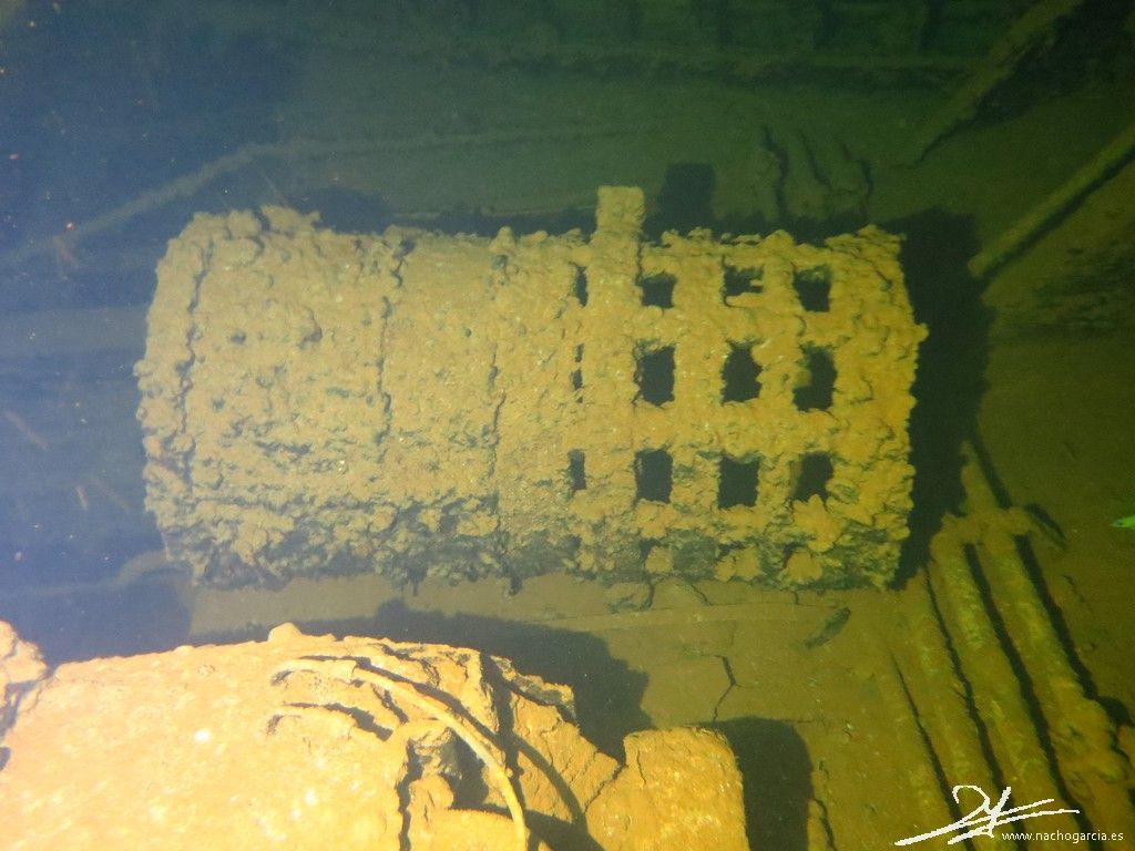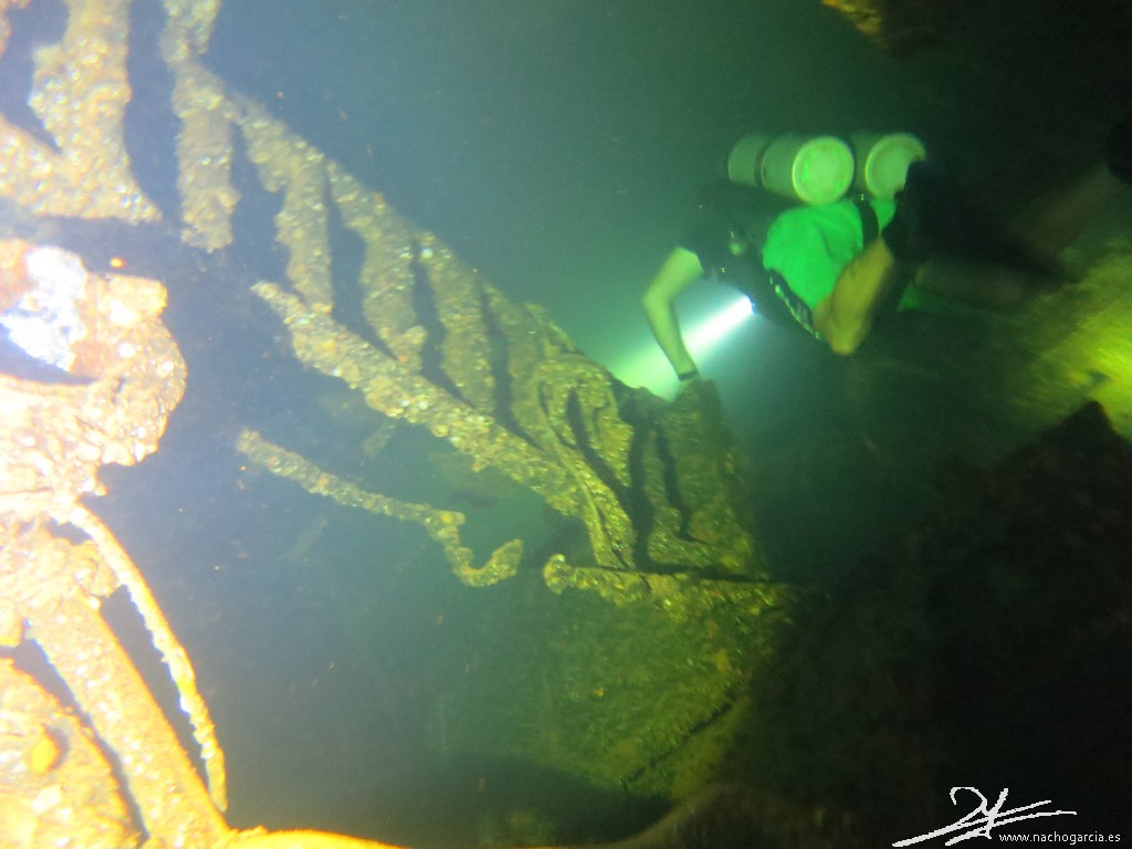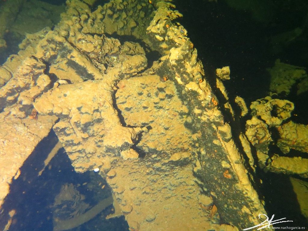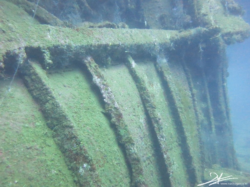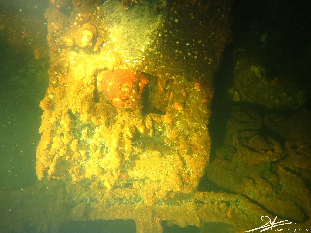 El pecio yace sobre el costado de babor a 33 metros de profundidad pero está en muy buen estado y con abundante vida.