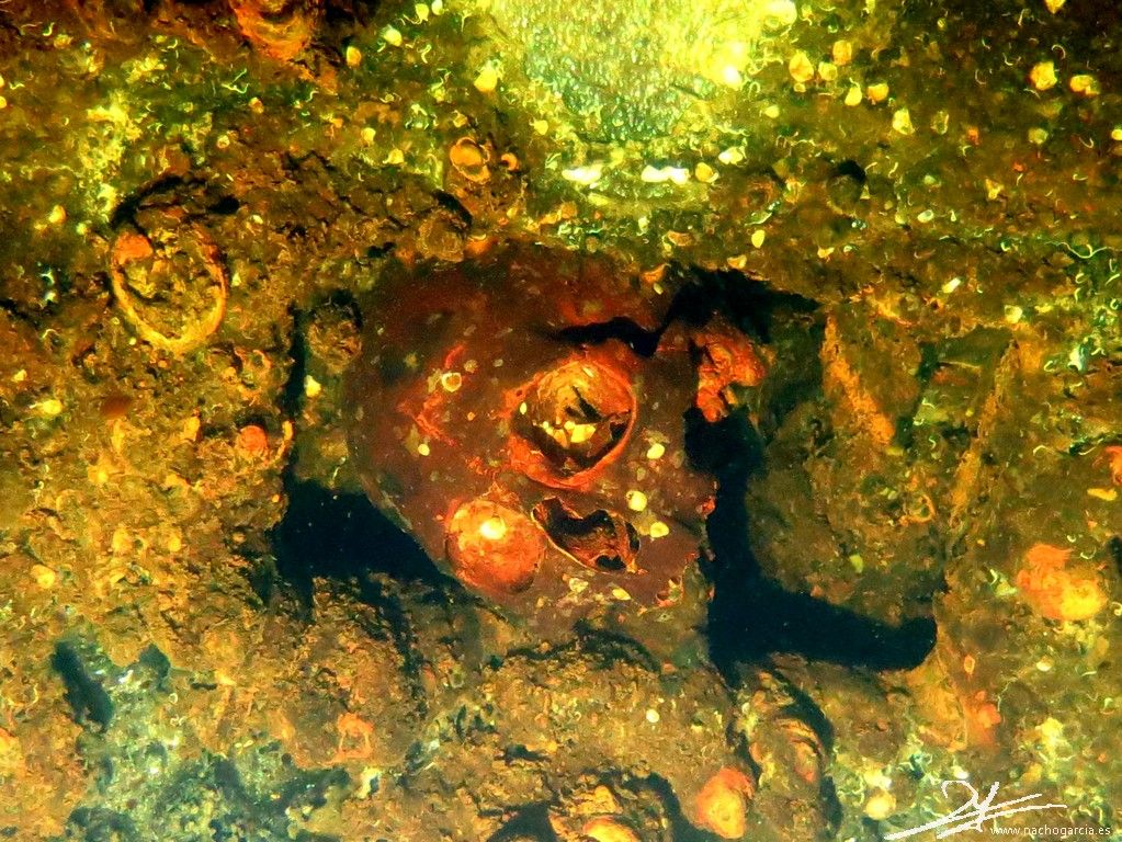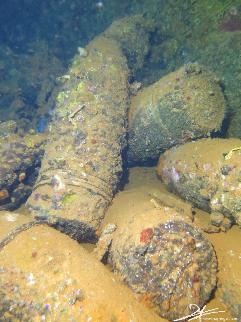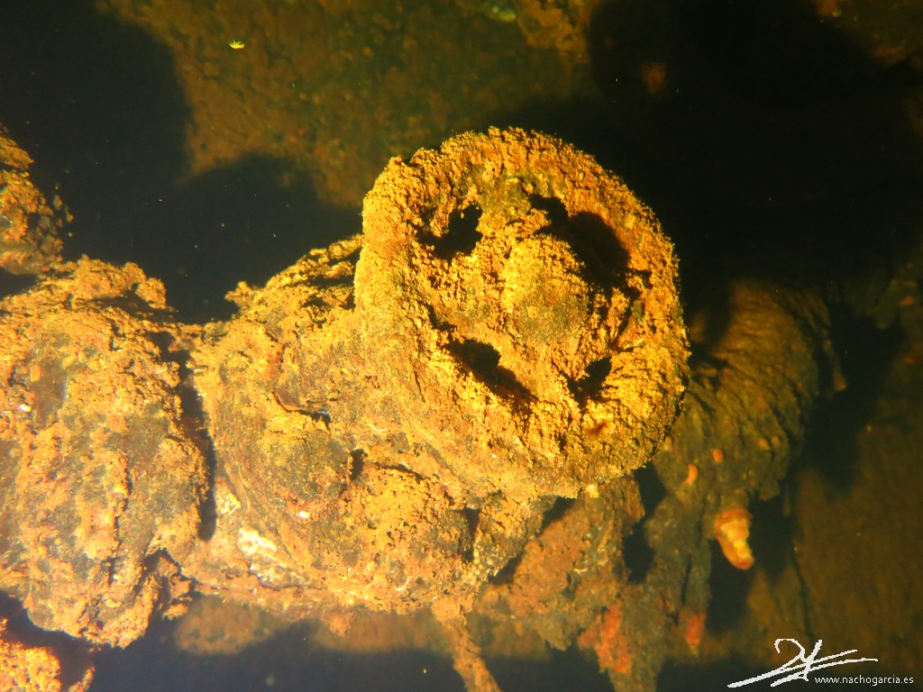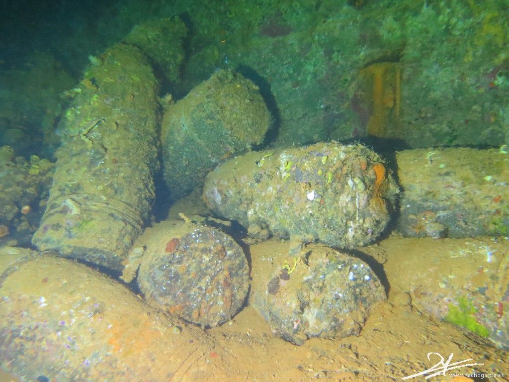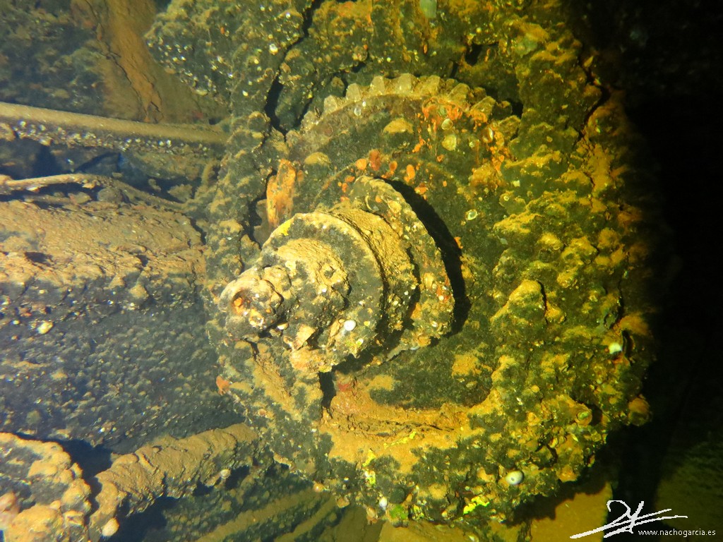 El pecio yace sobre el costado de babor a 33 metros de profundidad pero está en muy buen estado y con abundante vida.